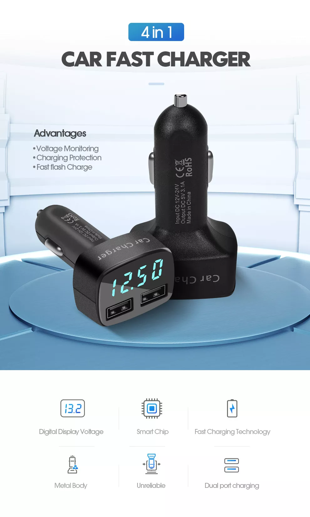 CARGADOR USB 4 EN 1 CON VOLTIMETRO